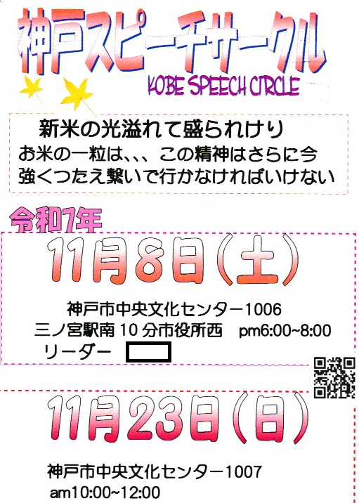 11月8日(土) 三宮駅南側 神戸市中央区文化センター 会議室1006 18時~